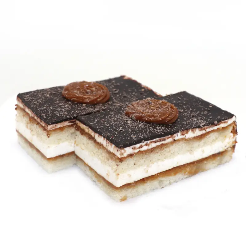 Вода, сахар, яйцо, мука пшеничная в/с, паста для сбивания, сорбат калия Е200, сироп, вареная сгущенка, суфле : смесь для приготовления суфле, вода, сливки, сгущенка, глазурь шоколадная, глазурь помадка шоколадная.