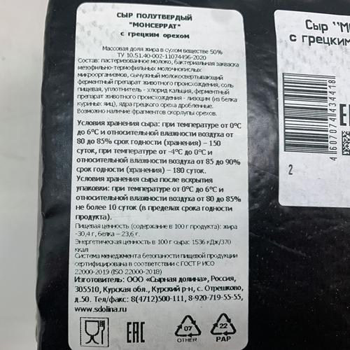 Монсеррат с грецким орехом 50% сыр кубик бзмж /СЫРНАЯ ДОЛИНА/